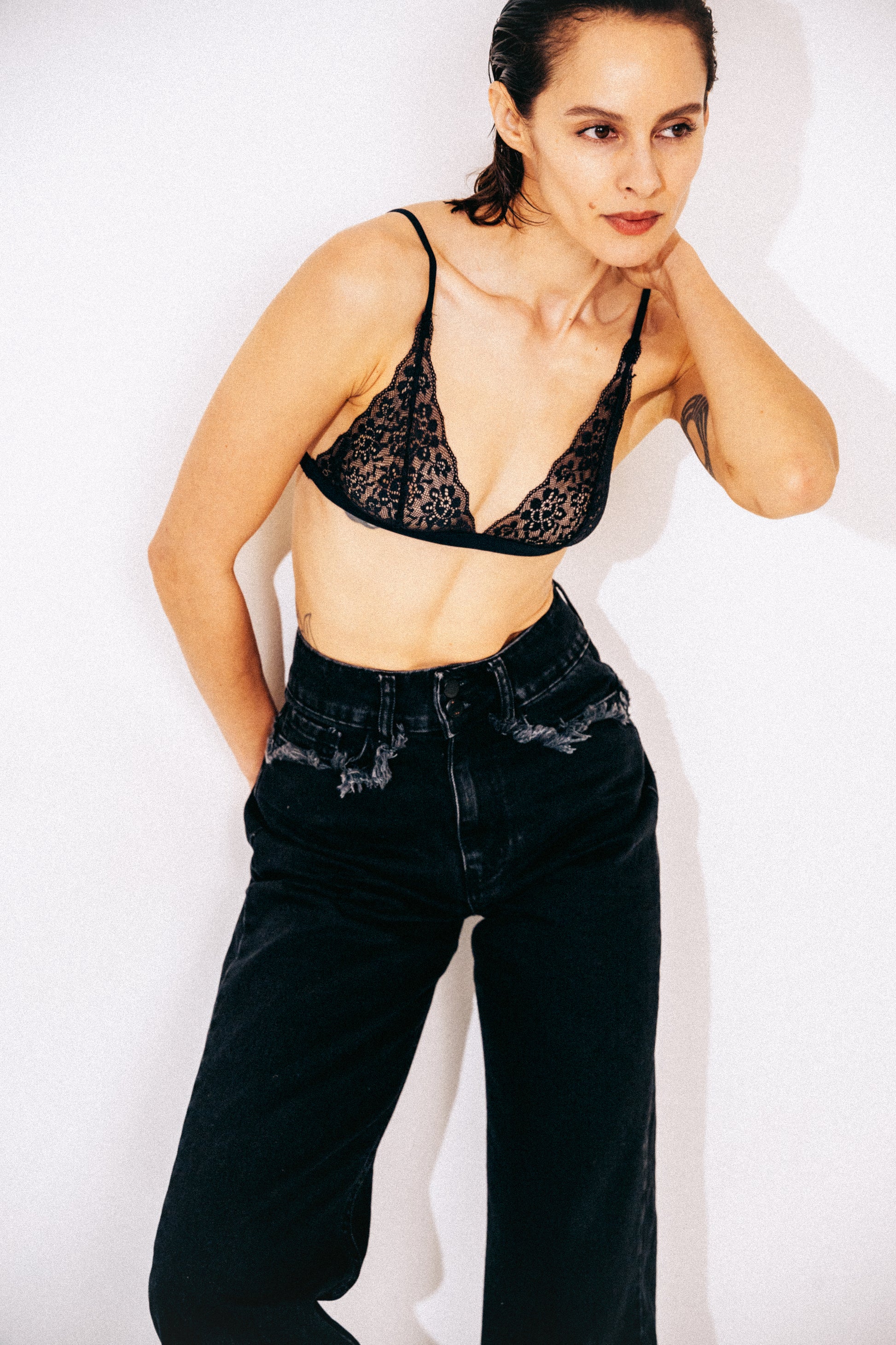 Crne farmerke dubokog struka sa resama na prednjem i zadnjem delu.